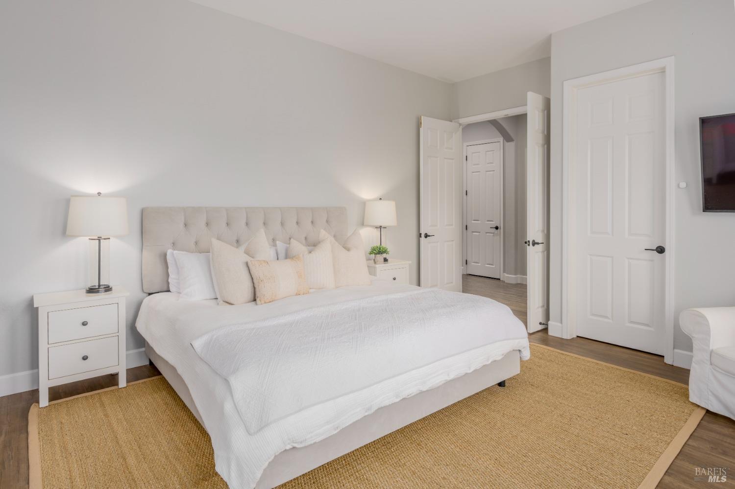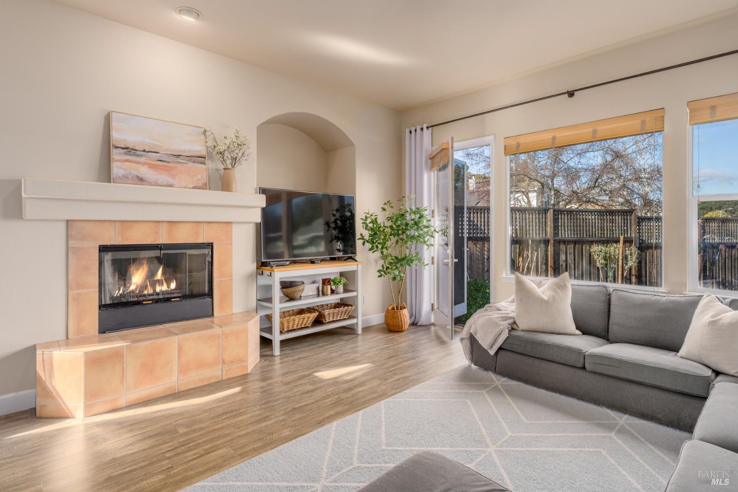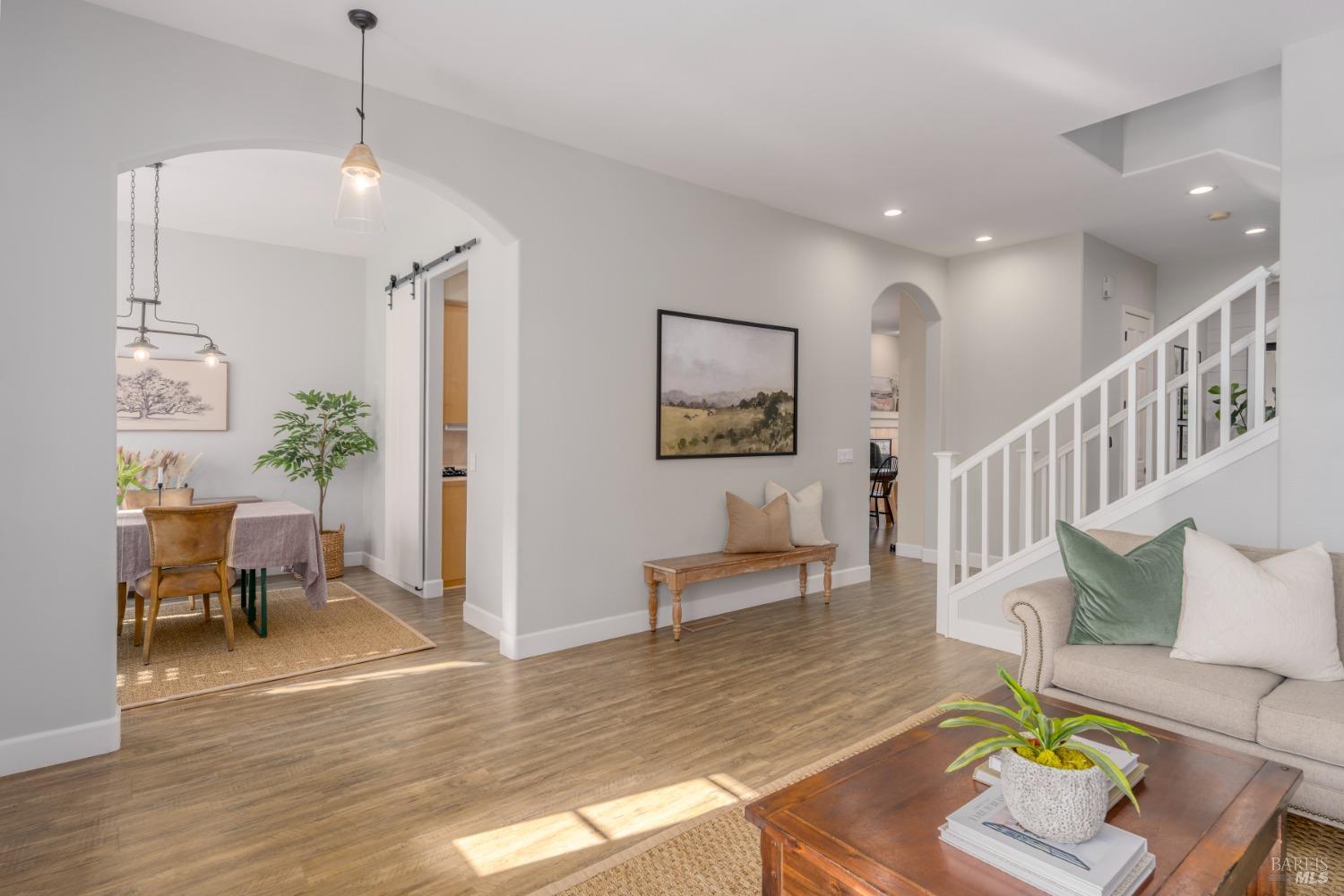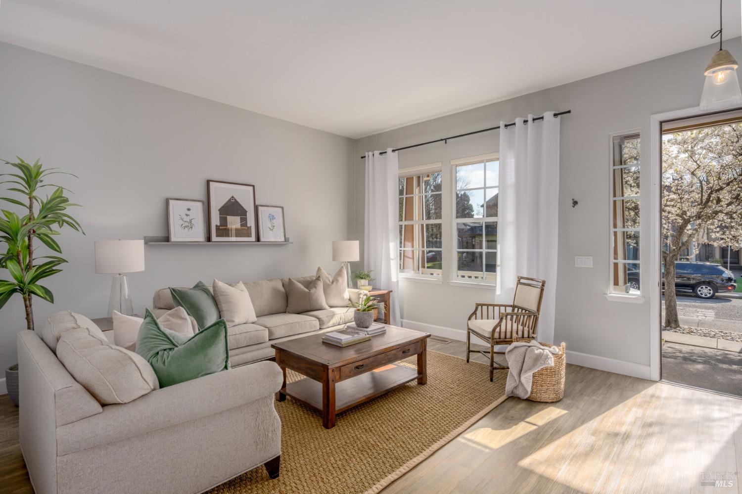 Located in the heart of Sonoma, this 4 bedroom, 2.5 bath home offers 2,575 sq ft of living space on a spacious corner lot. The inviting covered front porch leads into an open floor plan with high ceilings throughout and abundant natural light. Adjacent to the formal dining room, the kitchen features a large island, accessing the informal dining room and the second living room space. French doors open to the backyard with a cozy fireplace anchoring the family room. The main-level primary suite offers backyard access, an en-suite bath with a soaking tub and large, walk-in closet. Upstairs, three additional bedrooms provide space for guests, a home office, or flex use. Located within a block of the bike path, this home offers convenience and prime location in one of Sonoma's favorite neighborhoods.